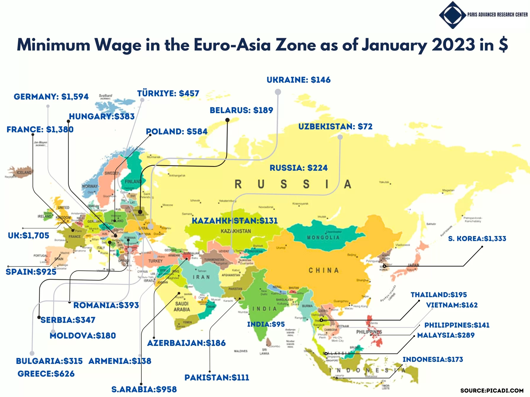 Minimum wage in the Euro-Asia Zone as of January 2023